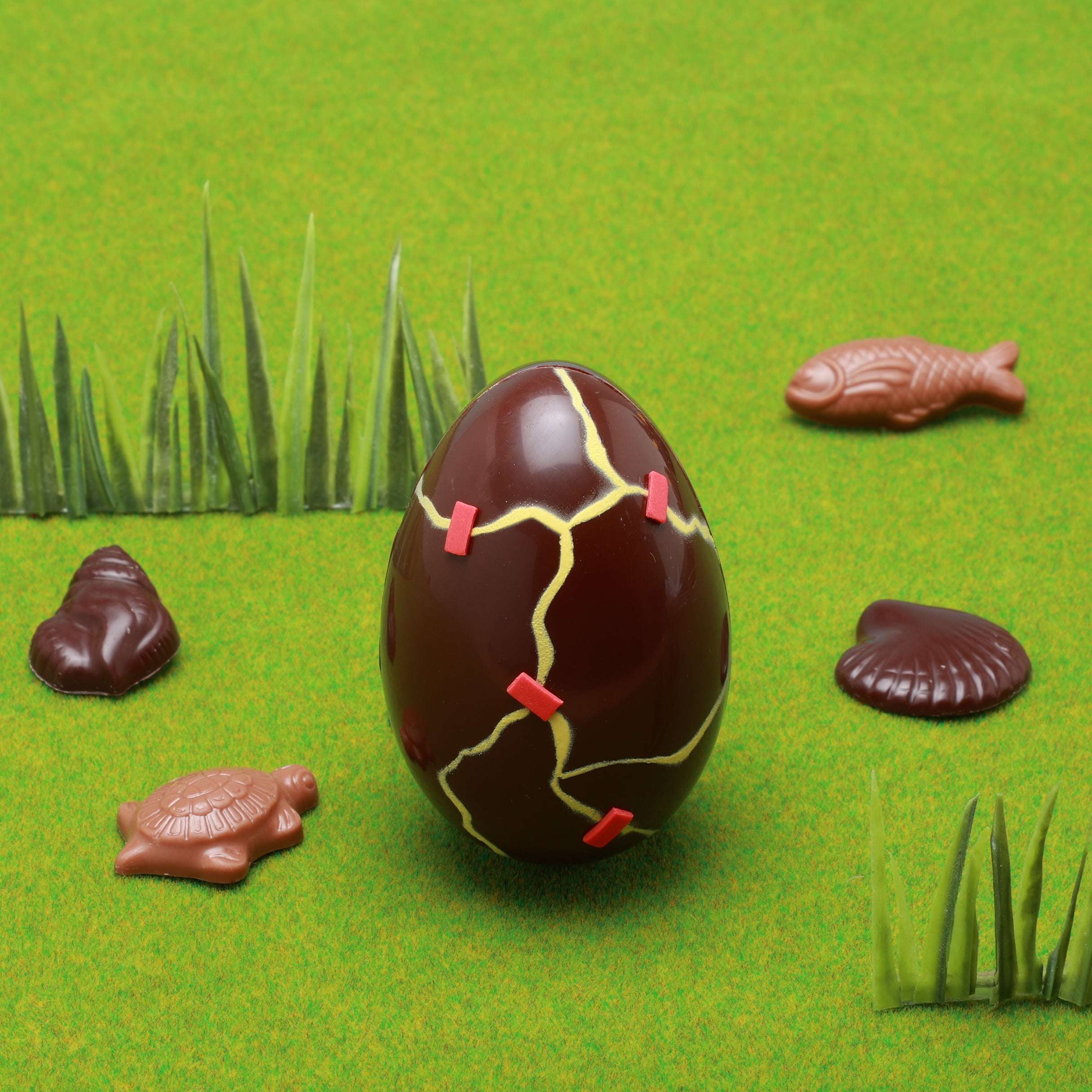 金継ぎで元通りになった卵の中には、海の生き物をかたどったショコラ「フリチュール」が4個入っています。