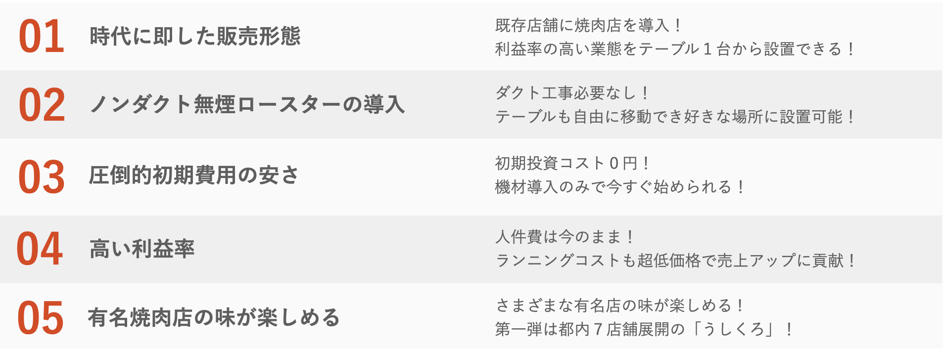 工事不要の無煙ロースターを店舗の一角に導入することで、テーブル1台分の「小さな焼肉店」をいつでも開業できます。既存店舗の中に2つの業態を置くことで、更なる売上増加と客単価の向上が望めます。ライセンス加盟料も固定のためランニングコストが低く、運営のしやすいモデルとなっています