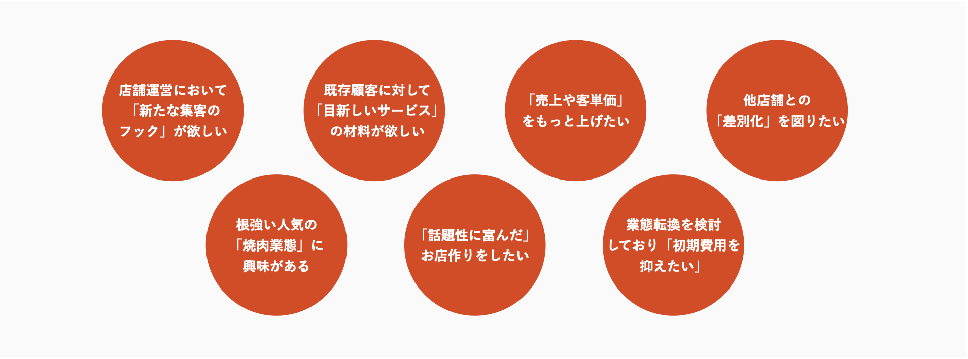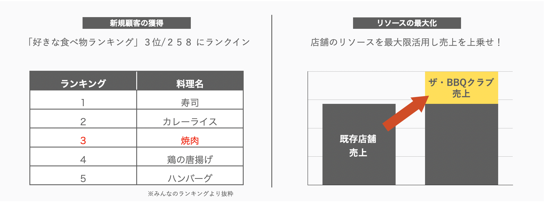 店舗内に焼肉店を設置することで、焼肉目的の新規顧客獲得が可能となります。既存のお客様に対しても既存メニューの他に「焼肉」という選択肢を与えることができるため、リピート率の向上も期待できます。