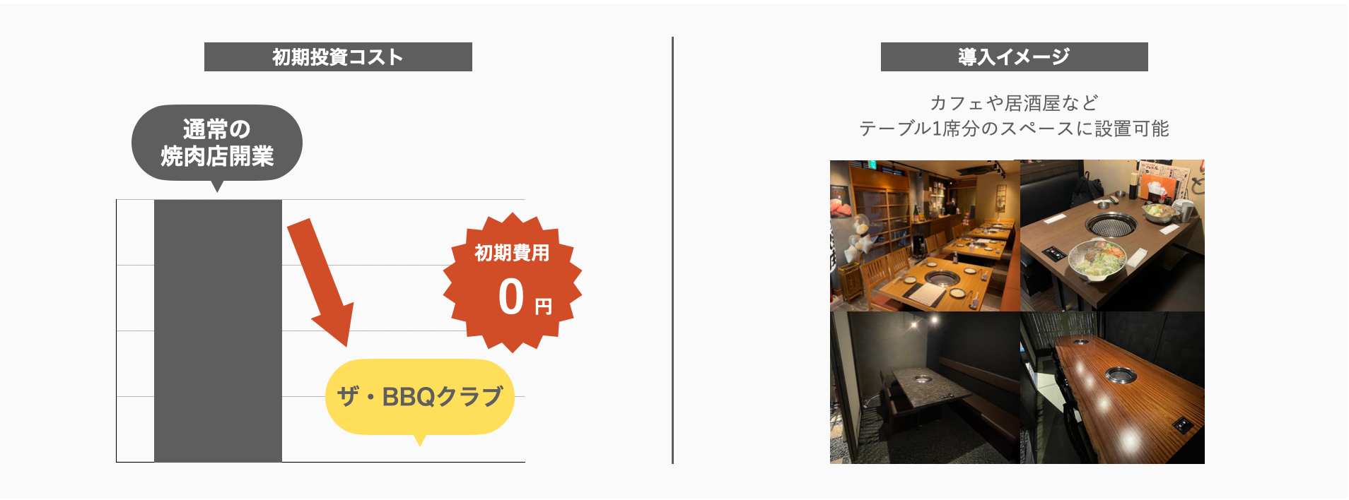 ザ・BBQクラブとは、既存店舗の業態に人気業態の焼肉メニューを導入することでイートイン型1店舗2業態が実現。これにより今までにない斬新な二刀流運営が可能となります。既存店舗の一角にテーブル1台だけの「小さな焼肉店」を作ることができる画期的な事業形態となります。