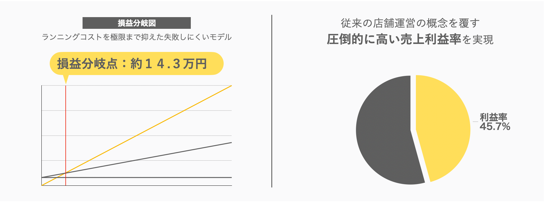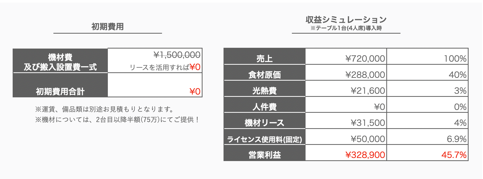 加盟金は0円!さらに機材をリースでご購入いただくことで、初期費用0円での開業が可能です。焼肉の特性上、調理の必要がなく、カット済みの食材を仕入れていただけますので、既存の人件費で売上をプラスできます。機材のリース費用を加味しても、月々30万円を超える利益率となっております。