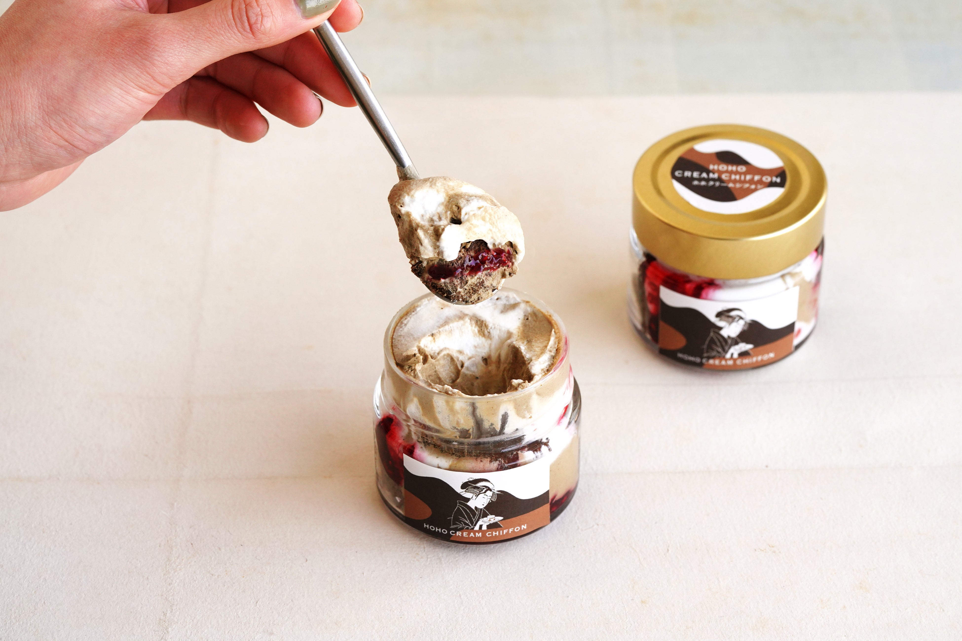 焦がし焙じ茶パウダーをふんだんに練り込んだふんわりシフォンと甘さひかえめクリームを小瓶に詰め込みました。アクセントに仕込んだ手作りベリージャムの甘酸っぱい香りがクリームシフォンに春らしいハーモニーを加えています。ボトルからスプーンですくって、ふわくしゅとろ〜り食感のクリームシフォンをお楽しみください。
