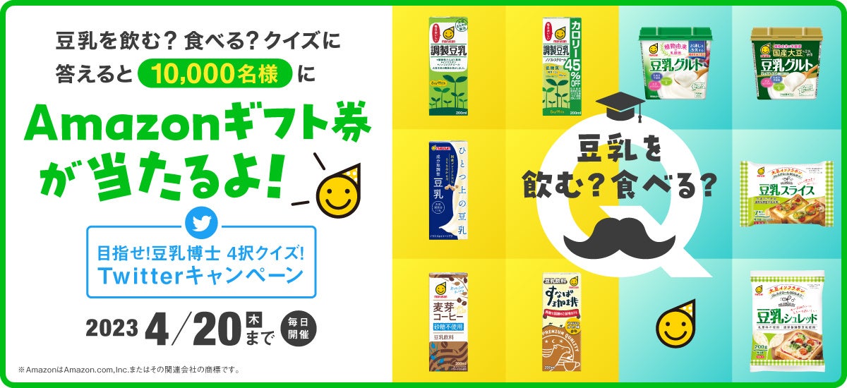 マルサンアイ株式会社(本社:愛知県岡崎市、代表取締役社長:堺 信好)は、Amazonギフト券がその場で10,000名様に当たる「豆乳を飲む?食べる?目指せ!豆乳博士 4択クイズ!Twitterキャンペーン」を2023年3月23日(木)より実施いたします。