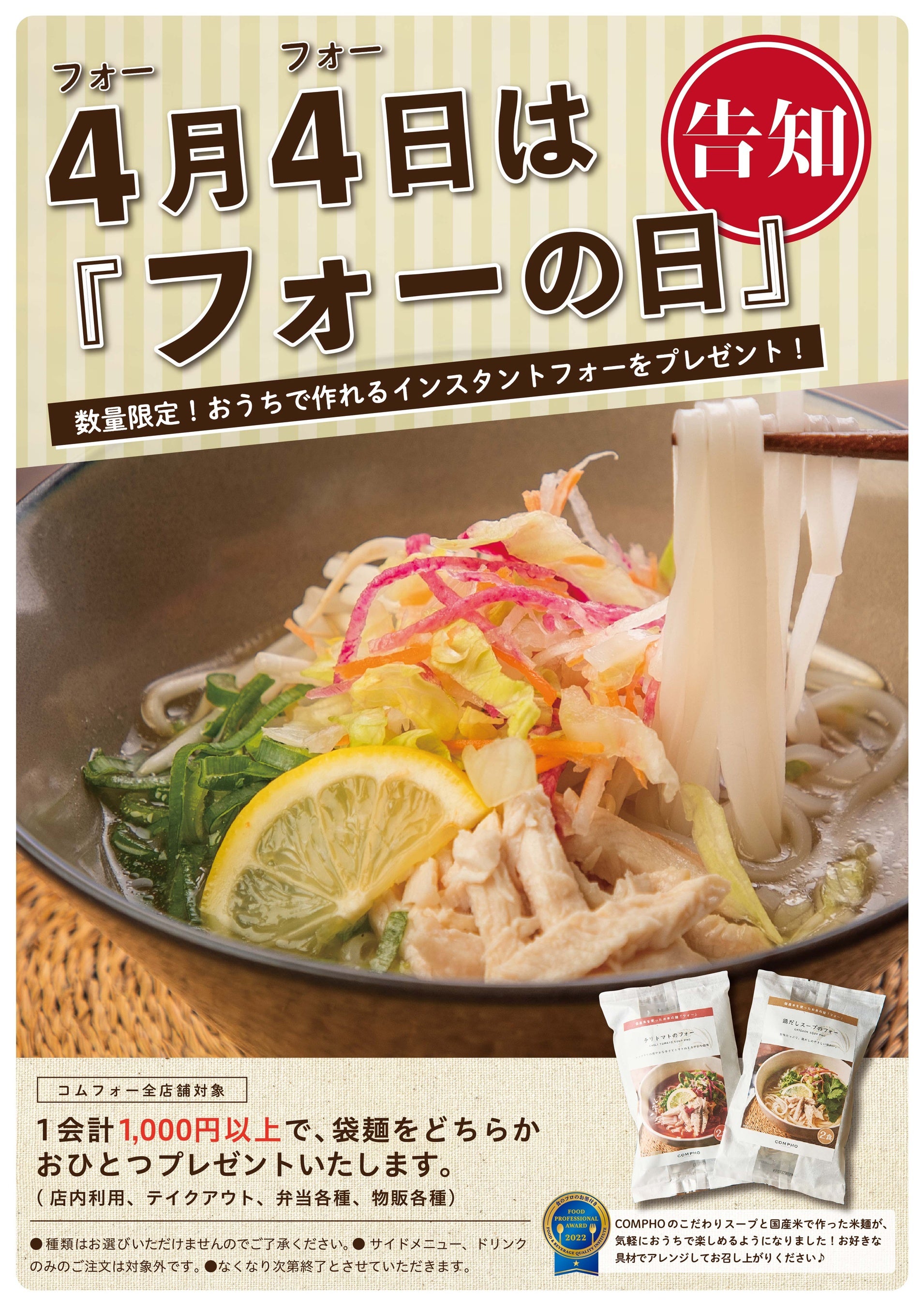 4月4日フォーの日は是非、お近くのCOMPHOでフォーをお楽しみください。