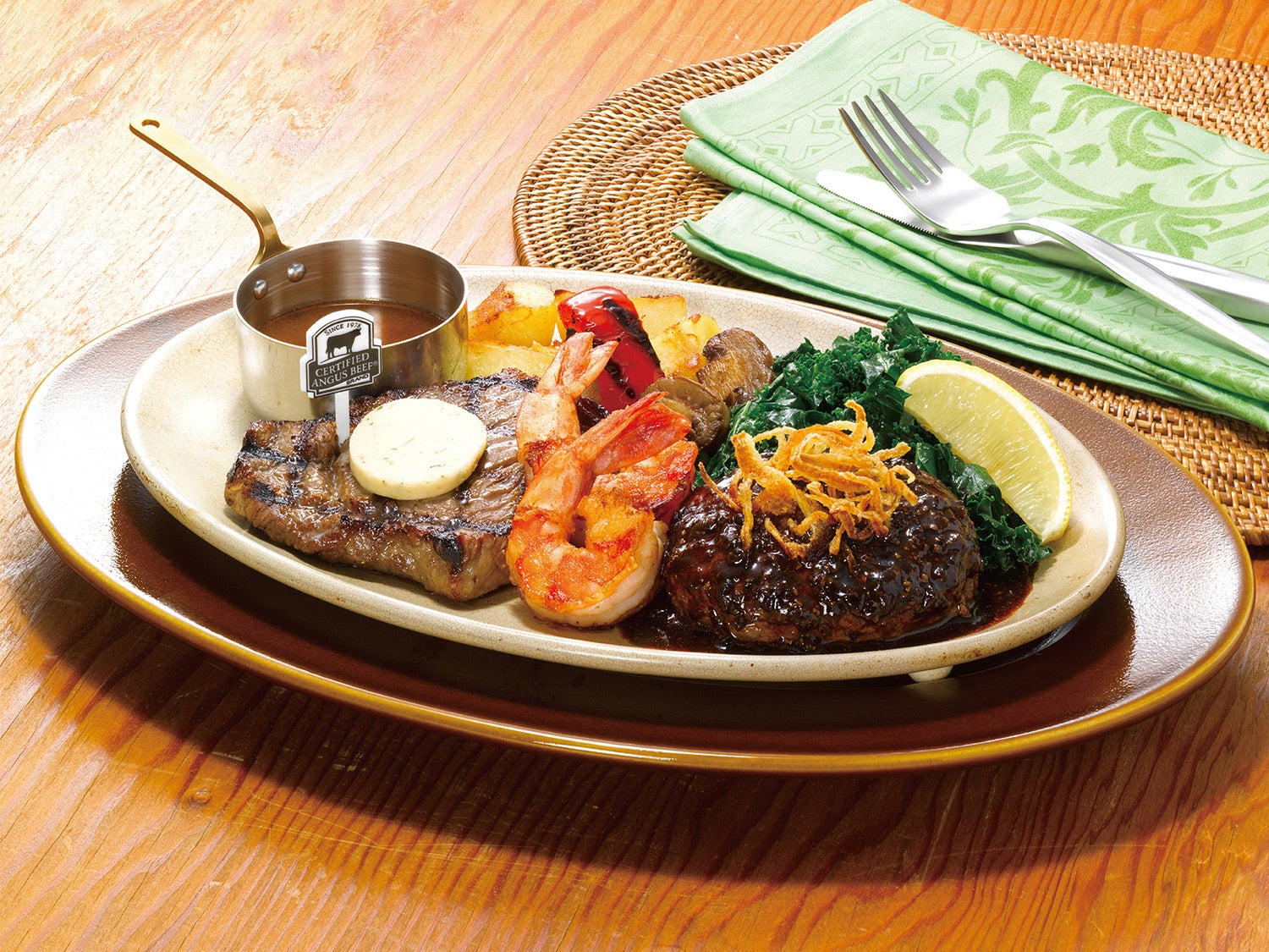 ステーキ100gと海老のグリル、ちいさな黒×黒ハンバーグを盛り合わせました。黒×黒ハンバーグはハンバーグのスパイスと良く合う黒胡椒の効いたブラックペッパーソースでお召し上がりいだたきます。