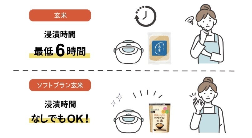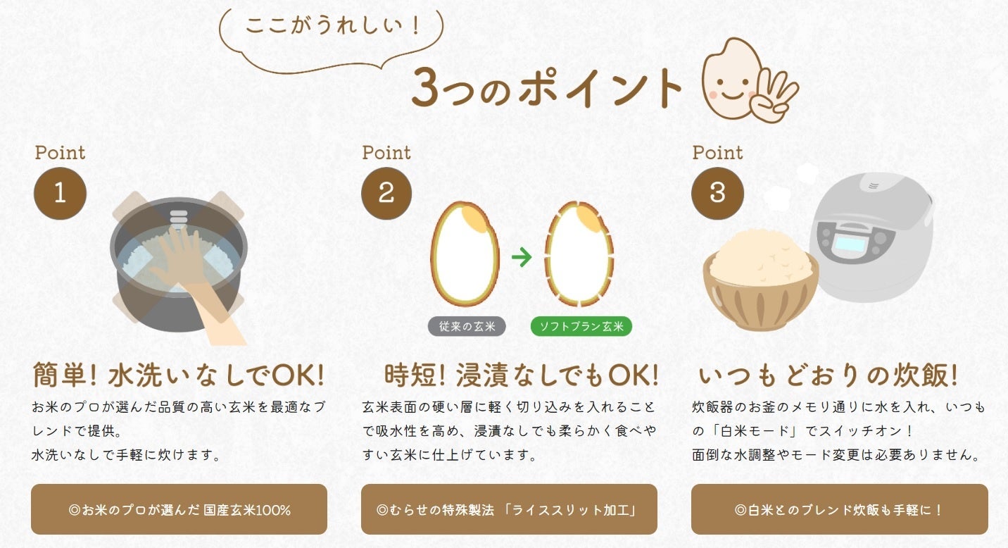 少子高齢化や働く女性の増加、アフターコロナにおける免疫意識の向上に伴い、健康志向はますます高まってきています。自然の栄養素がぎゅっとつまった健康米である玄米への興味関心は高まっているものの、食べ方への不安(炊飯が面倒そう…)や味への不信(硬そう、まずそう…)などから今まで敬遠されてきた方も多くいらっしゃいました。「ソフトブラン玄米」は、水洗いや事前浸漬、炊飯時の水調整などの「炊飯の面倒さ」をとことん解消し、味わい深いうま味と雑味のバランスで仕上げた国産玄米です。