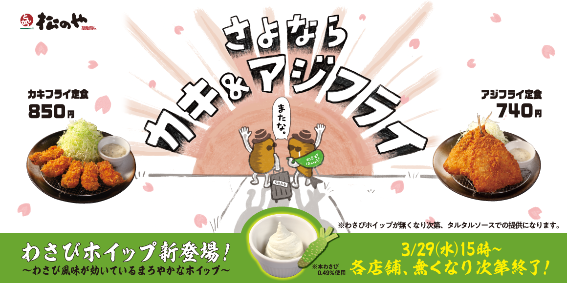 昨年9月より販売しておりますカキフライおよびアジフライは、3月29日(水)以降、順次販売終了となります。たくさんのお客様にご愛顧いただいておりましたカキ&アジフライの有終の美を飾るべく、つーんとしたわさびの風味をまろやかなホイップで仕立てた「わさびホイップ」も添えてご提供します。サクッとジューシーなカキフライ、ふっくらやわらかなアジフライをつければ新感覚の味わいに!