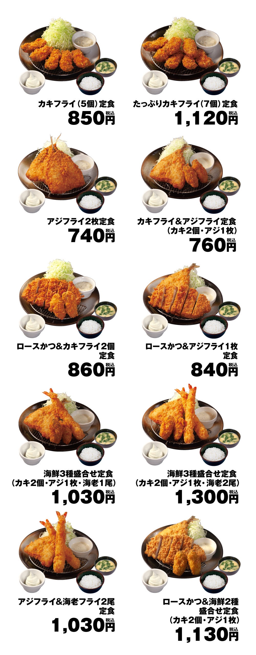 | 商品名 カキフライ(5個)定食 850円 たっぷりカキフライ(7個)定食 1,120円 アジフライ2枚定食 740円 ロースかつ&カキフライ2個定食 860円 ロースかつ&アジフライ1枚定食 840円 海鮮3種(カキフライ2個・アジフライ1枚・海老フライ1尾)盛合せ定食 1,030円 海鮮3種(カキフライ2個・アジフライ1枚・海老フライ2尾)盛合せ定食 1,300円 カキフライ(2個)&アジフライ(1枚)定食 760円 アジフライ&海老フライ2尾定食 1,030円 ロースかつ&海鮮2種(カキフライ2個・アジフライ1枚)盛合せ定食 1,130円 ※お持ち帰りいただけます。お持ち帰りのみそ汁は、別途60円でお買い求めいただけます。 ※全て税込価格です。また、店内・お持ち帰りの税込価格は同一です。 対象店舗 一部店舗を除く全国の松のや・松乃家 |