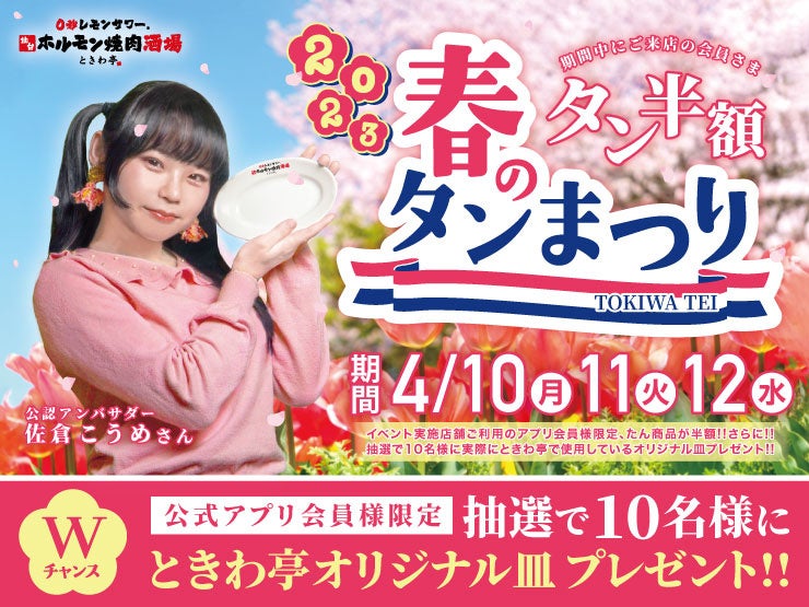この度、春の恒例イベントとなっている『ときわ亭 春のタン祭り』を開催いたします。仙台名物⽜タンなど⼈気のタンメニュー4品を半額で提供いたします。対象商品は、「仙台⽜たん三種盛り」「ねぎ塩たん」「旨とろ豚たん」「旨とろねぎ塩豚たん」でいずれも⼈気商品ばかりです。さらに、期間中、ときわ亭をご利⽤いただいたアプリ会員向けに、アプリで応募してくれた⽅の中から抽選で10名様に『ときわ亭ロゴ⼊りオリジナルプレート』をプレゼントいたします。