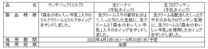 「ランチパック(ミルク)」には、「森永のおいしい牛乳」入りのミルククリームとミルクホイップをサンドしました。「生ドーナツ(牛乳ホイップ)」と、「生クロワッサン(牛乳ホイップ)」には、生クリームと「森永のおいしい牛乳」を使用したホイップをサンドしています。
