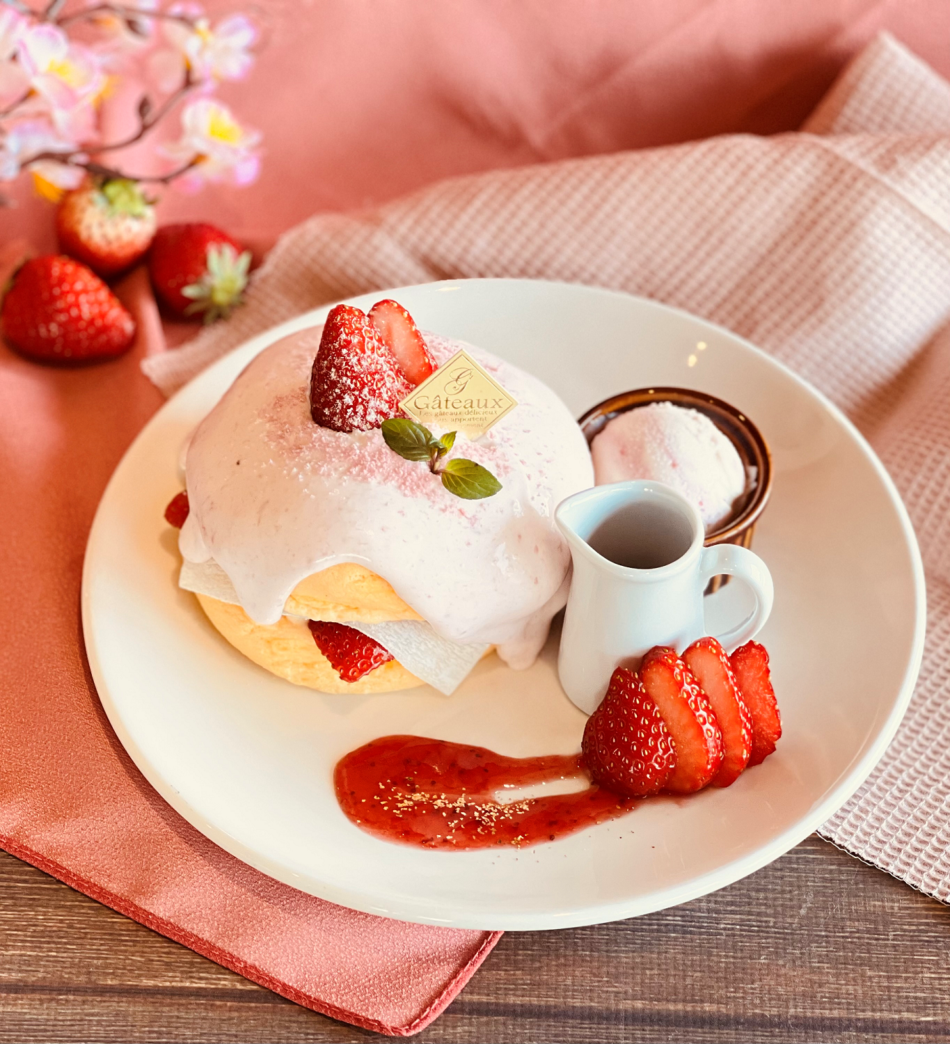 ふわふわのパンケーキの間にカスタードクリーム・いちご・もちもちの求肥を贅沢に挟み、自家製の“ふわとろ”ないちごクリームをかけた見た目も春らしい一皿。別添えの甘酸っぱい苺ソースをかけてお召し上がりください。