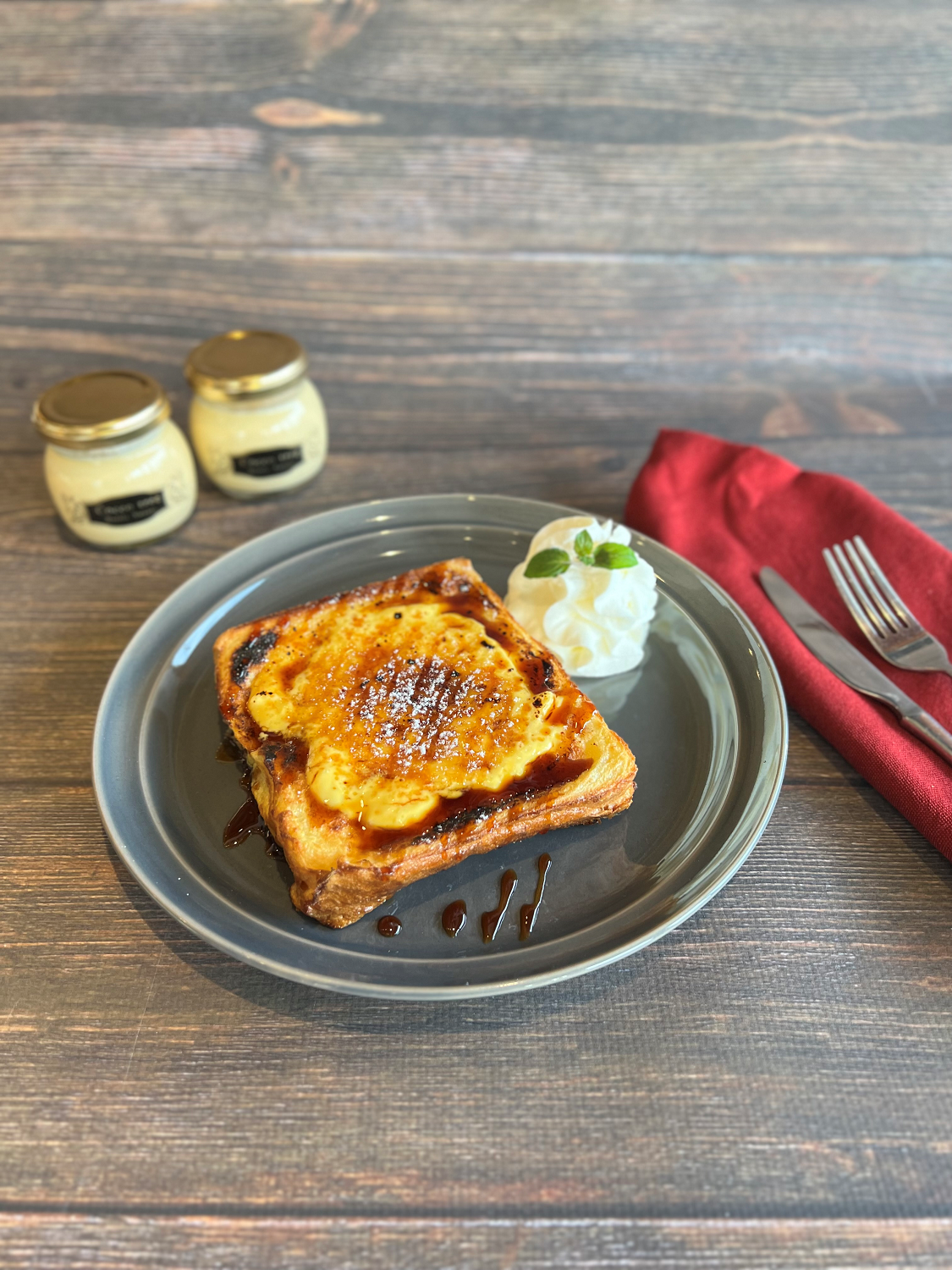 こだわりの材料で作った当店のぷりん液に厚切りのパンをじっくり漬け込み焼き上げたプリン風味のフレンチトースト。