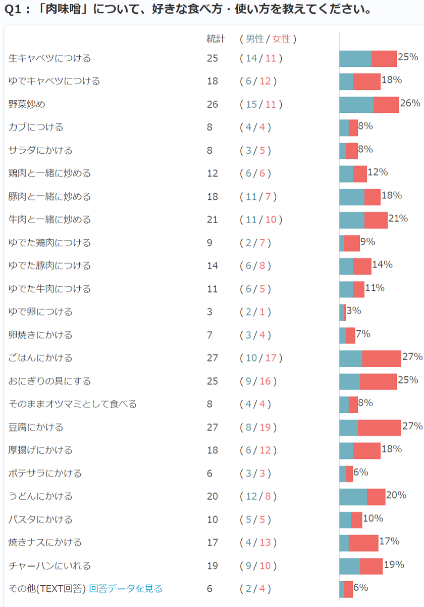 男性には特に「野菜炒め」が人気で、女性には「ごはんにかける」が好まれる傾向があることが分かりました。