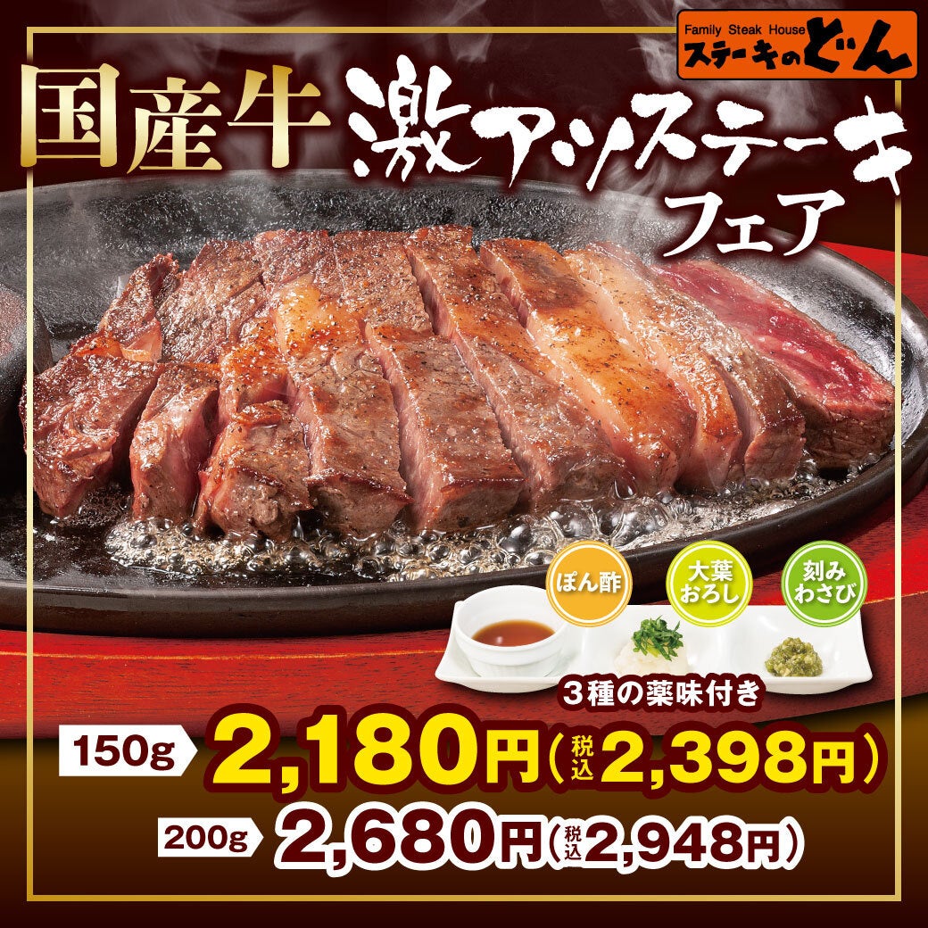 『ステーキのどん』では、2023年3月27日(月)より、全店でフェアメニューとして「国産牛激アツステーキ」を販売いたします。アツアツの鉄板の上で音と香りも一緒に楽しむ『ステーキのどん』1番人気の「激アツステーキ」をいつもよりリッチにお楽しみいただけます。