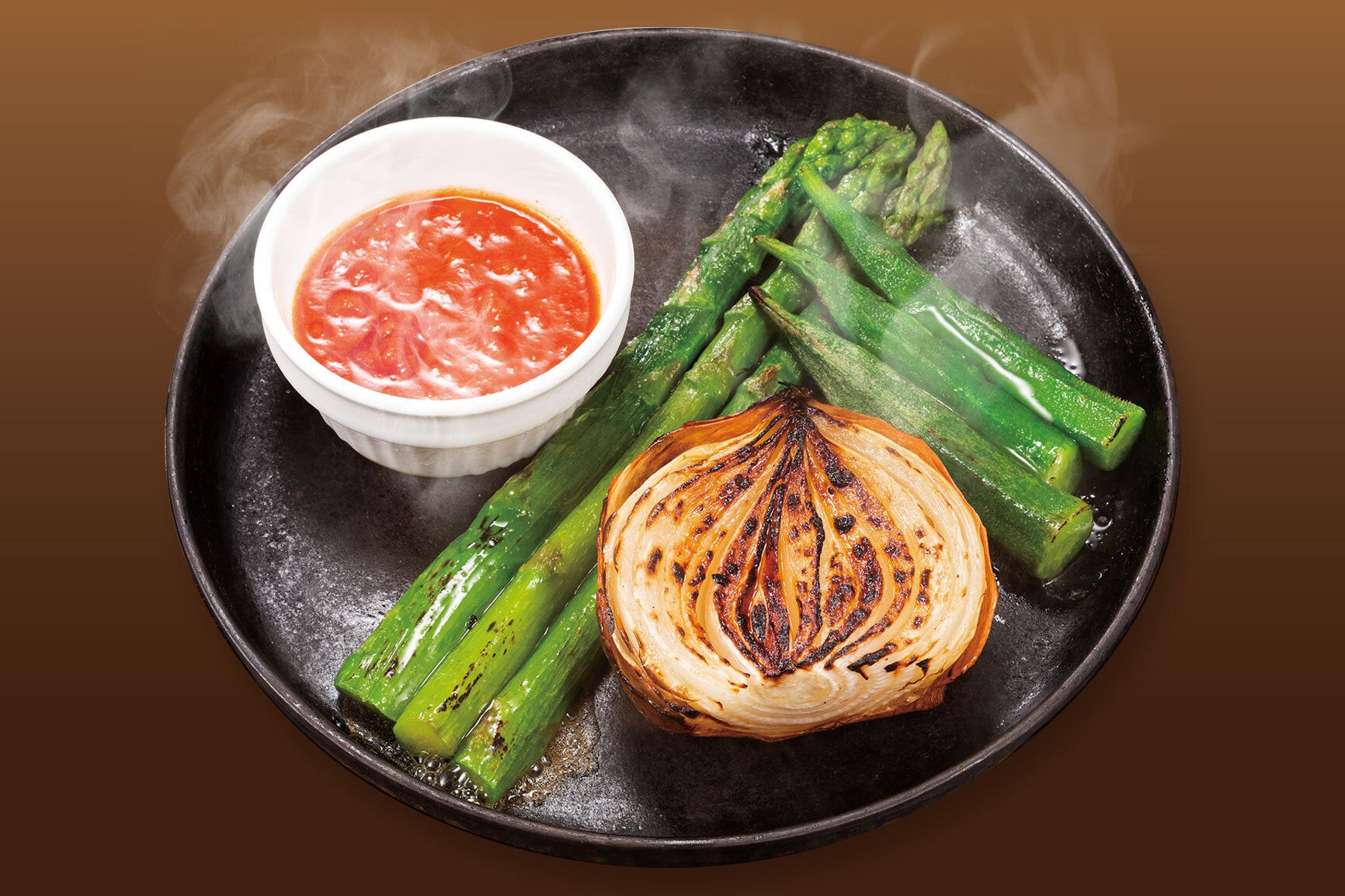 ステーキやハンバーグの調理に使用している高温のオーブンで野菜のジューシーさを残しつつ、甘みと旨みを引き出しました。皮付きでグリルし、適度なジューシーさを残しつつ甘みを引き出した玉ねぎ、香りと歯ざわりが良くねばねばプチプチ食感が楽しいオクラ、ステーキ付け合わせの定番で疲労回復効果のあるアスパラを「ステーキのどん」特製のトマトガーリックソースにつけてお召し上がりください。