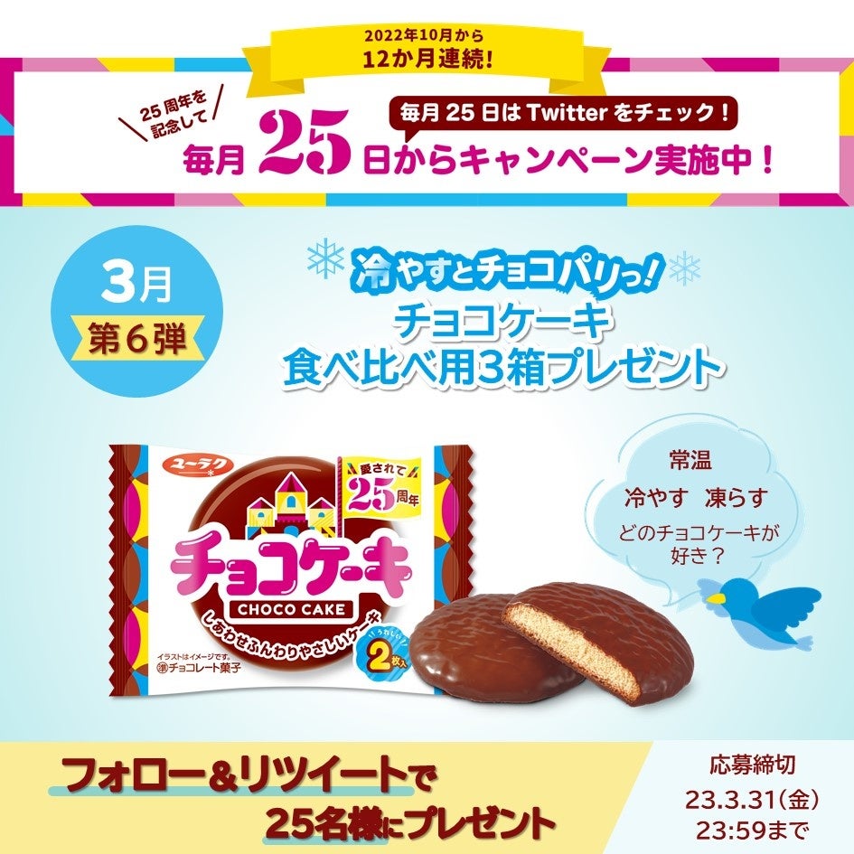 ユーラク「チョコケーキ」は1997年の発売から25周年を迎えたことを記念し、より多くのみなさまにチョコケーキのおいしさを知っていただけるよう、2022年10月より12か月連続でチョコケーキが当たるキャンペーンを実施中です。25周年に掛けて毎月25日に開催する当キャンペーンの第6弾を、2023年3月25日(土)昼12時より開催いたします。賞品はチョコケーキのお好みの食べ方を見つけてもらえるよう、常温・冷やす・凍らす用にチョコケーキ3箱をご用意しました。