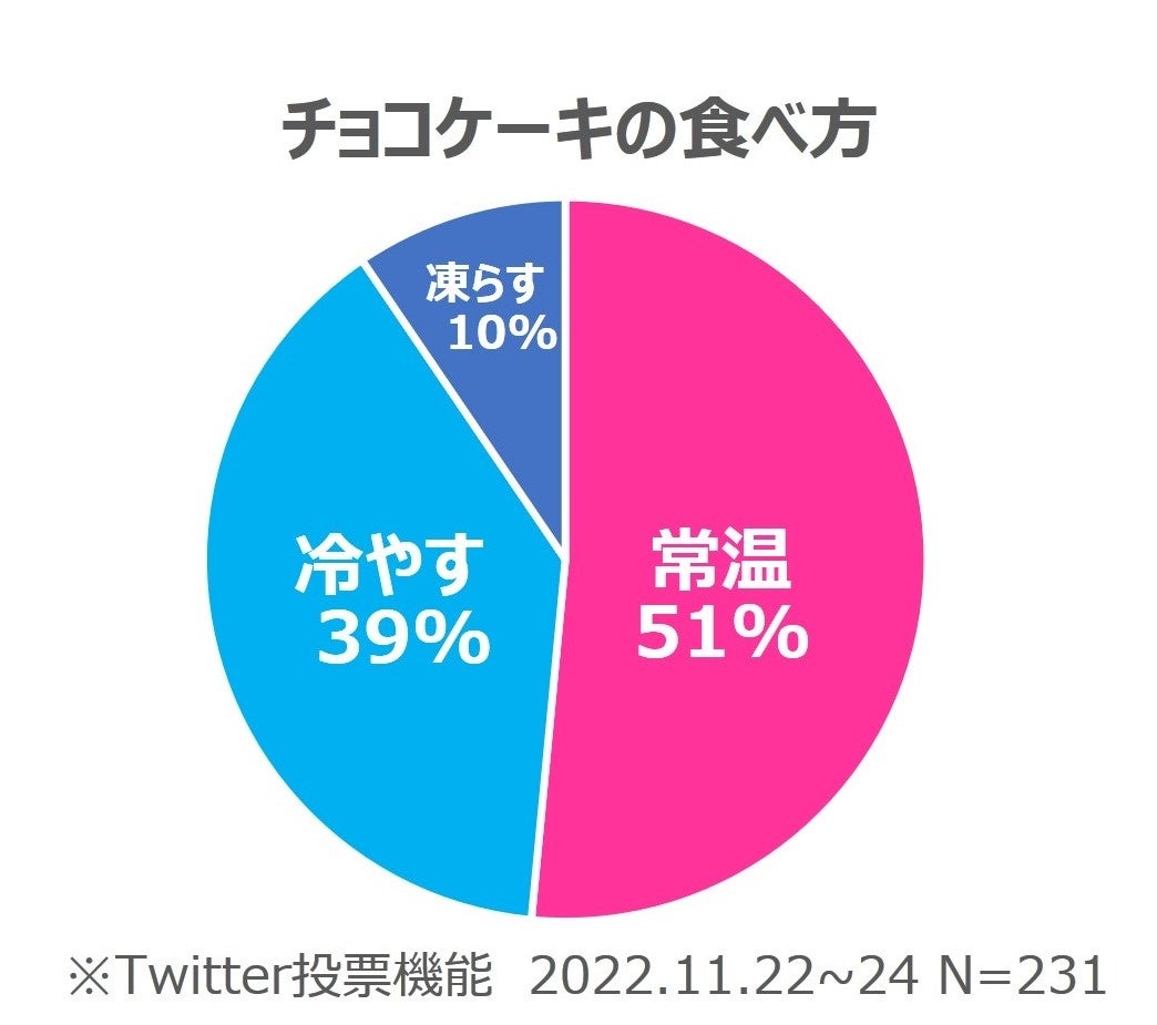 公式ツイッター「ユーラクチョコケーキさん」にて、チョコケーキの食べ方を尋ねたところ、「冷やして食べる」派は39%(※)となり、「凍らす」と合わせると半数近くにのぼることが分かりました。