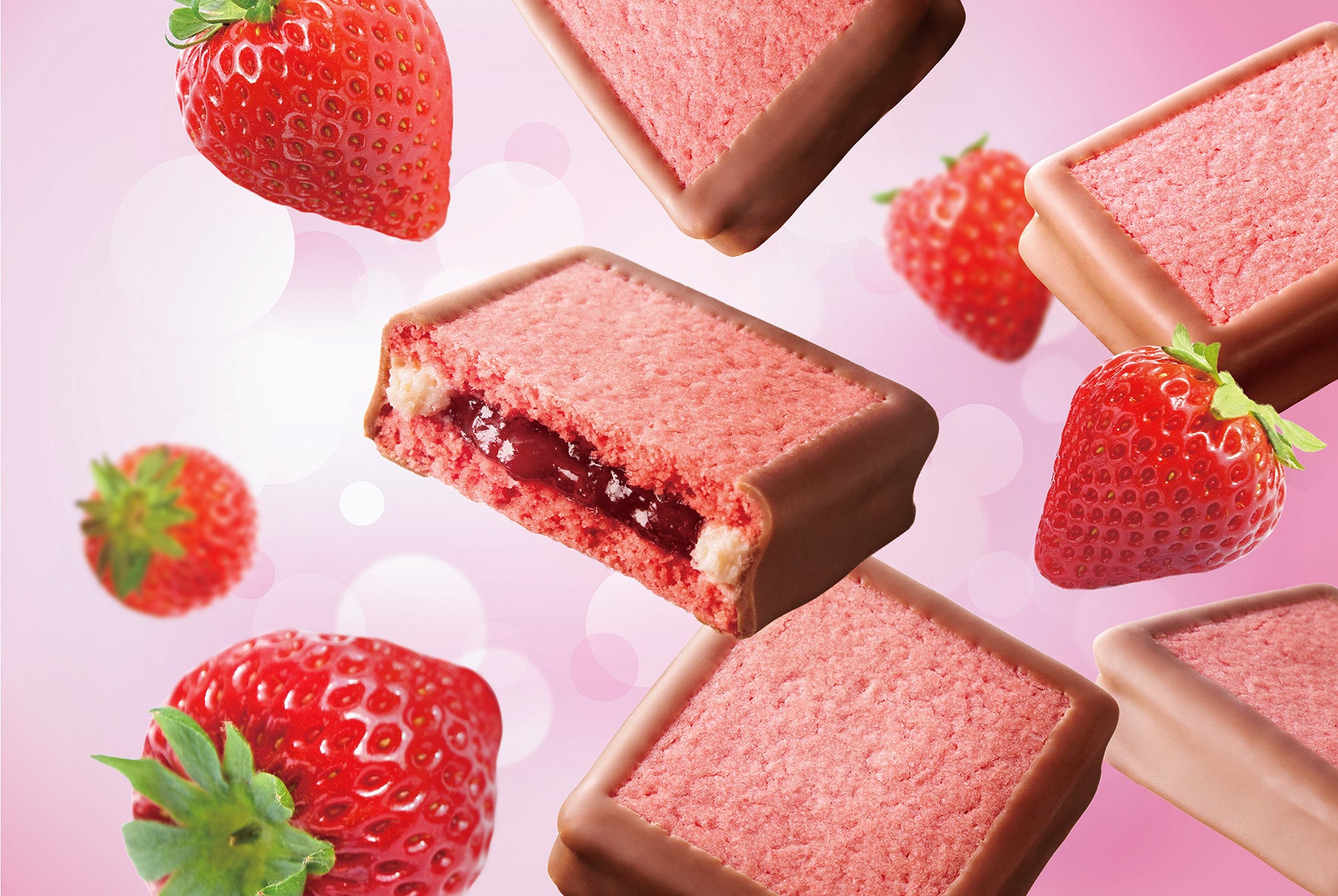 ・いちごをイメージした色合いの薄焼きクッキーで、フリーズドライのいちごを合わせたバタークリームをいちご