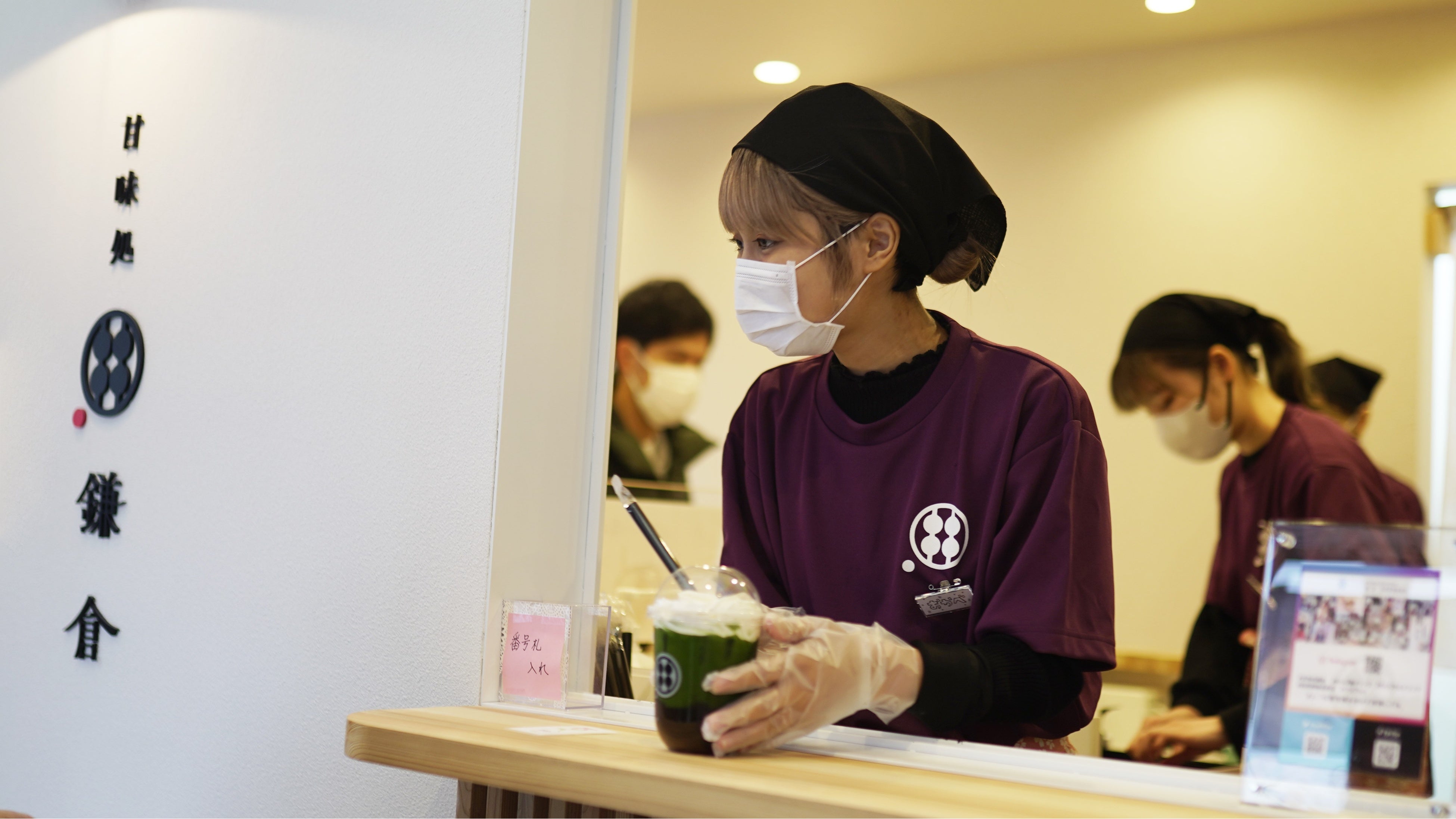 甘味処鎌倉は、テイクアウトという手軽さの中にも詰め込んだ最大級のおもてなし=感動体験をご一緒にお持ち帰り頂けるよう心掛けております。お客様に「来て良かったな。また来たいな」と思って頂ける体験をおもてなしを通じ、その地域とともに感じて貰いたいという想いを込めて1つ1つ丁寧にご提供させて頂いております。