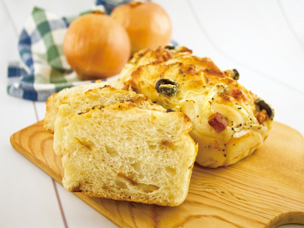 フォカッチャ生地にフライドオニオン、チーズソースを包み、タマネギとベーコン、オリーブをトッピングして焼き上げました。