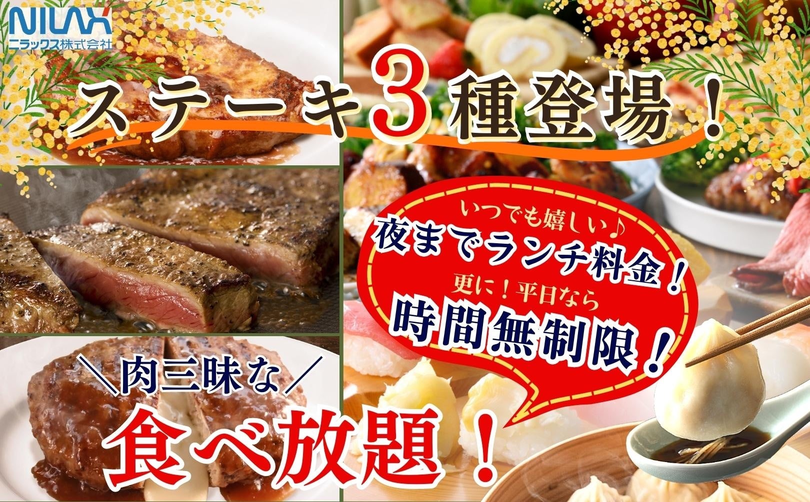 食べ放題のテーマパーク、 ニラックス株式会社(本社:東京都武蔵野市、 代表取締役社長:崎田 晴義)が運営する「グランブッフェ」など14店舗にて2023年3月14日(火)より『ビーフ・トンテキ・チーズインハンバーグ』の3種の肉料理が食べ放題にて登場いたしました!
