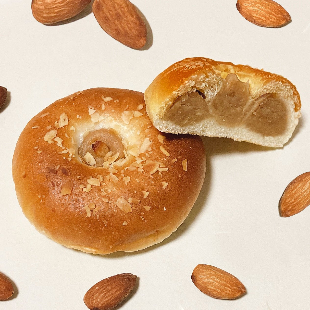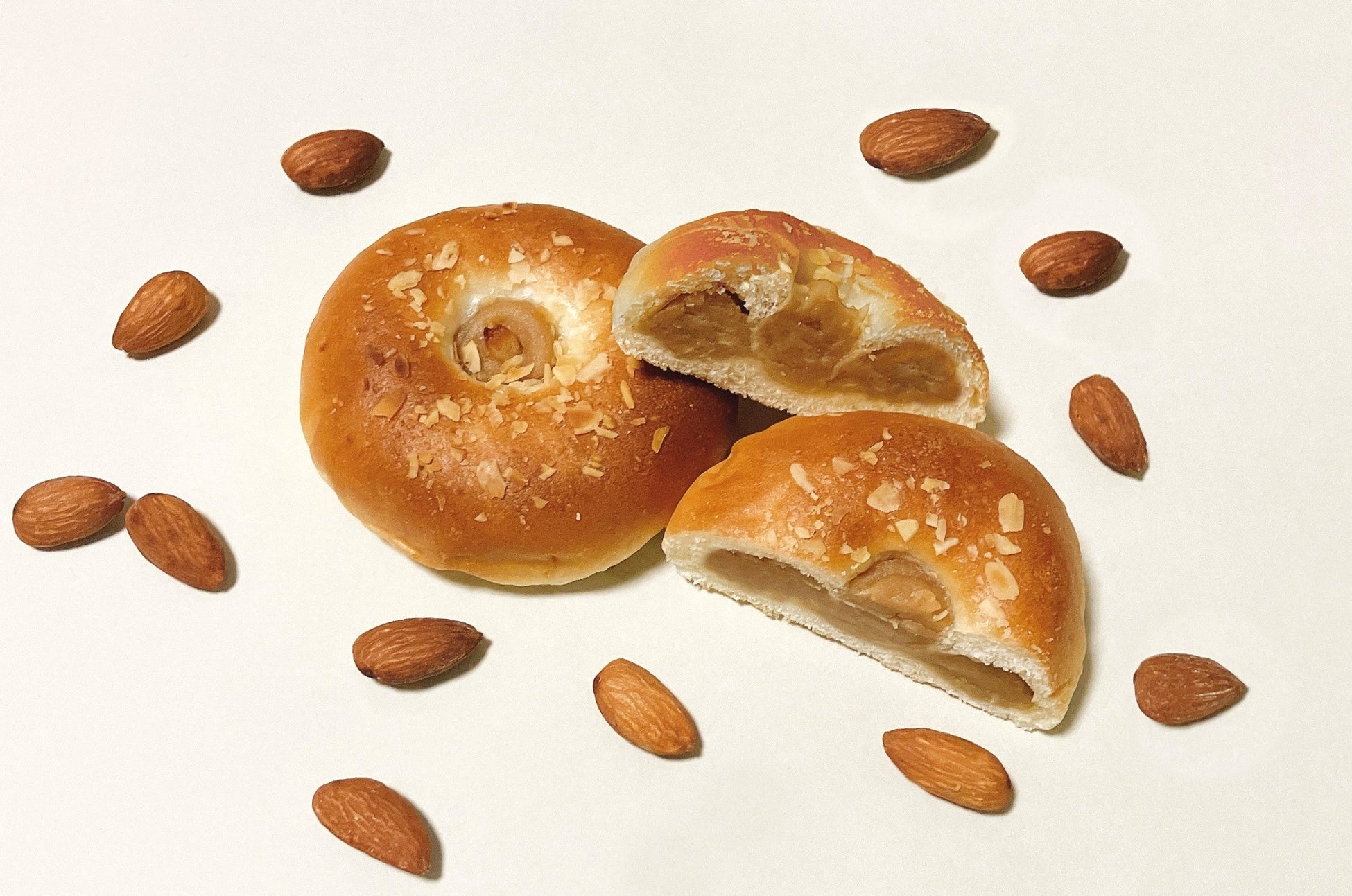 酒種入りの木村屋オリジナル生地で、風味の良いアーモンドミルクを使用した白あんベースの餡に、砕いたアーモンドとキャラメリゼしたアーモンドのペーストを入れて、味と香りを包み込んで焼きあげました。