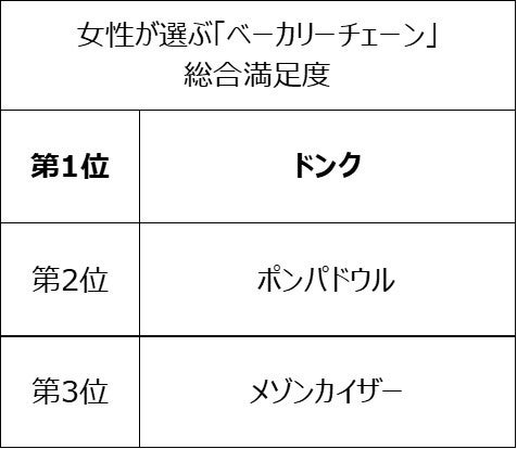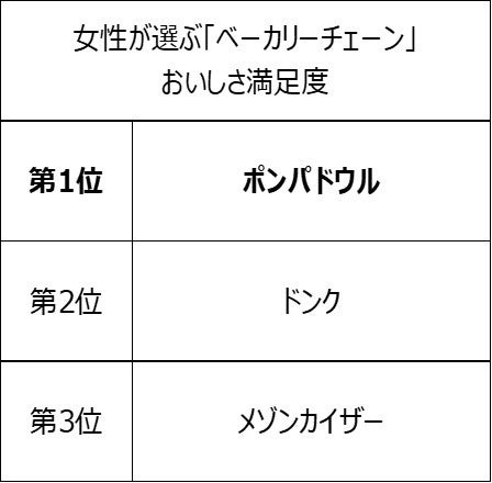 2023年1月に実施した調査において、「ドンク」「ヴィド・フランス」が女性が選ぶ「ベーカリーチェーン」で同率の利用率第1位、 「ポンパドウル」はおいしさ満足度第1位 、「ドンク」は総合満足度第1位(同店は価格満足度も第1位) 、「アンデルセン」はリピート率第1位を受賞しました。