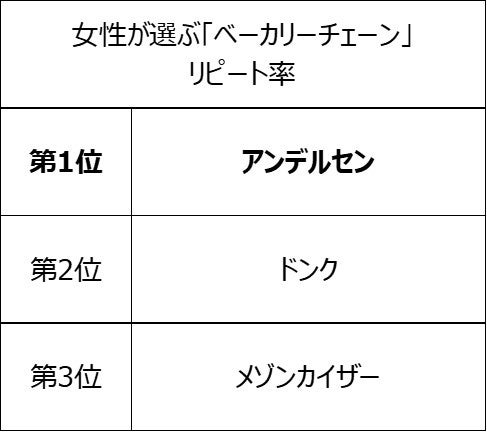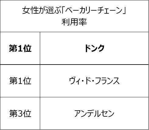 ◆女性が選ぶ「ベーカリーチェーン」ランキング、利用率1位は同率で「ドンク」「ヴィ・ド・フランス」