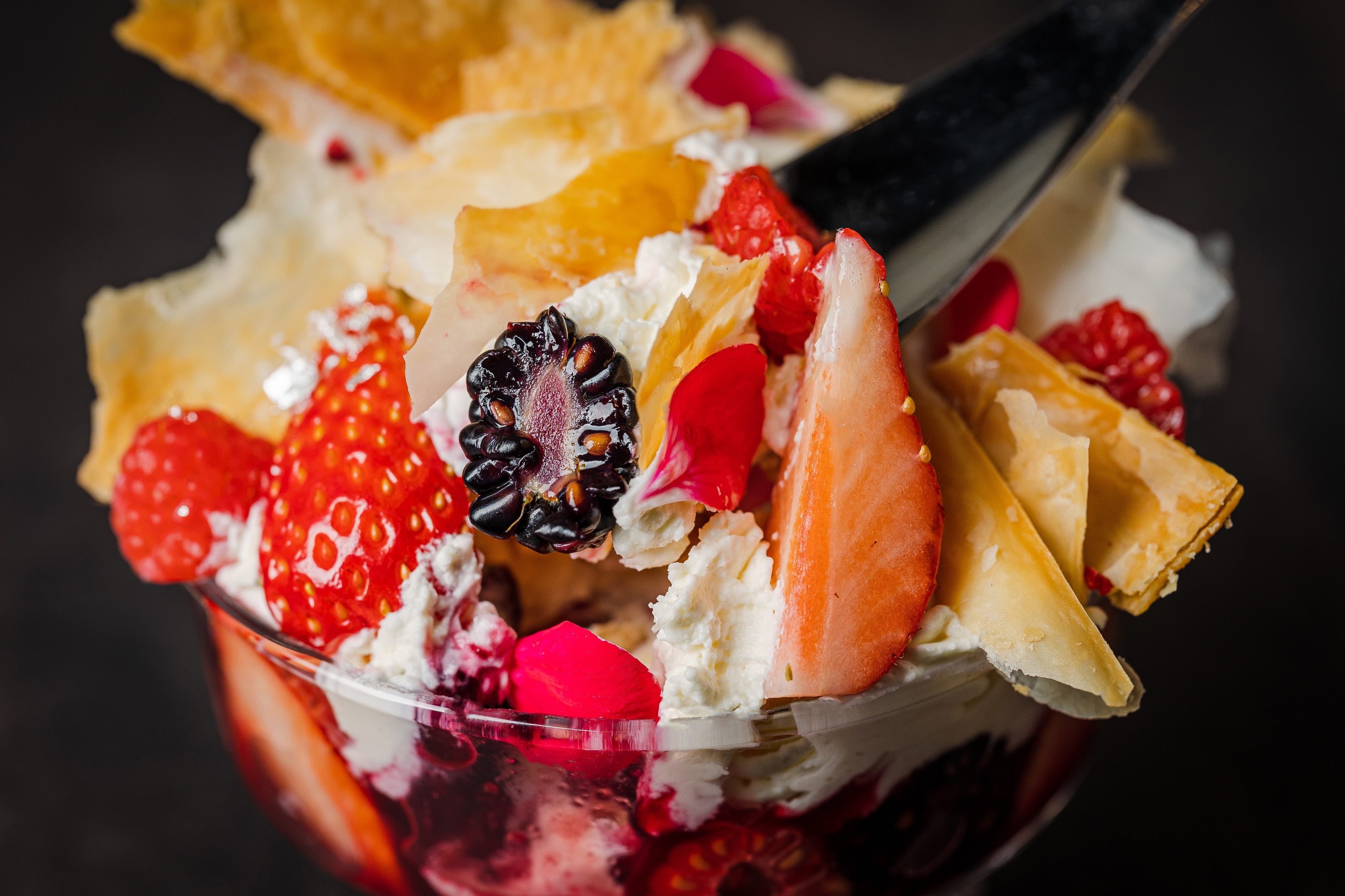 滑らかなホワイトチョコレートムースとザクザク食感のパイ生地が絶妙なハーモニーを奏で、濃厚なバニラクリームと果実感たっぷりのベリーのコンポートが春のフレッシュさ溢れる味わいを生み出します。ブラックベリーやラズベリー、ストロベリーを使用したミルフィーユ仕立ての上品なパフェで、春の訪れをお楽しみください。