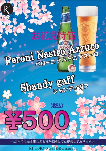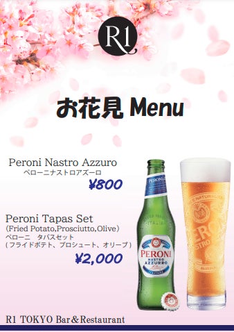 六本木のR1TOKYO Bar&Restaurantでは、六本木ヒルズや東京ミッドタウンなど近隣施設でのお花見需要に合わせ、プレミアムイタリアンビール”ペローニナストロアズーロ”とコラボにて、期間限定のキャンペーンを開催中。