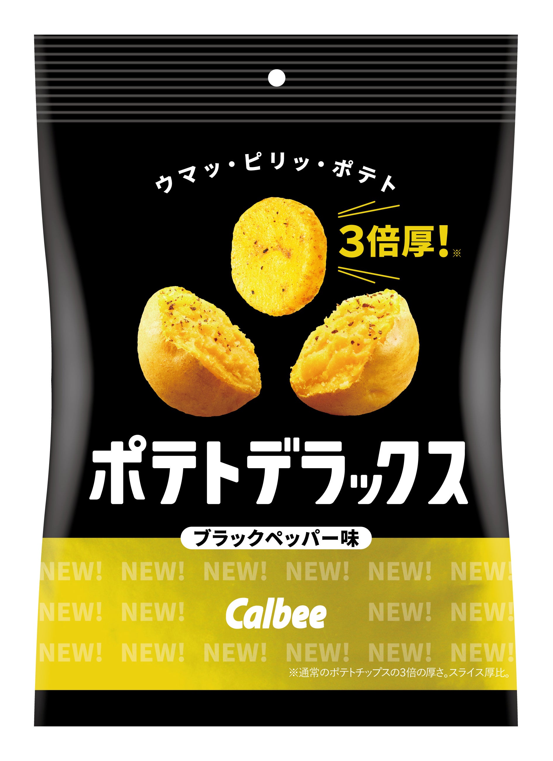 カルビー株式会社(本社:東京都千代田区、代表取締役社長:伊藤 秀二)は、カルビー最厚級※1で通常の3倍の厚さ ※2のポテトチップス「ポテトデラックス」シリーズを初めてリニューアルし、『ポテトデラックス マイルドソルト味/ブラックペッパー味/サワークリーム味』を2023年4月上旬より全国の店頭で順次切り替えて発売します。