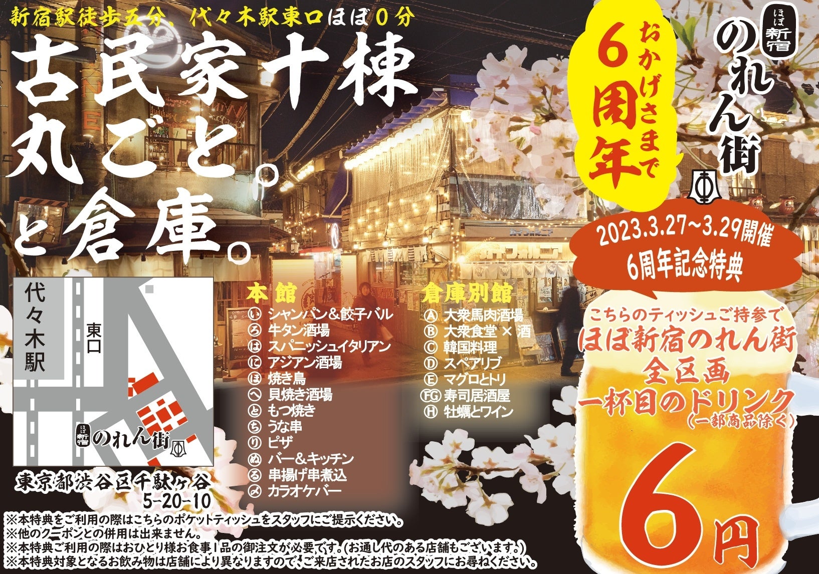 新宿・代々木の新名所として、2017年の開業以来沢山の皆様にご好評を頂いている”古民家十棟丸ごと”&”倉庫まるごと”横丁『ほぼ新宿のれん街』。おかげさまで2023年3月で6周年を迎える事となりました。『ほぼ新宿のれん街 』では日頃の感謝を込め、『最初の一杯目のドリンク6円』キャンペーンを3月27日〜29日の3日間で実施致しますのでお知らせ致します。