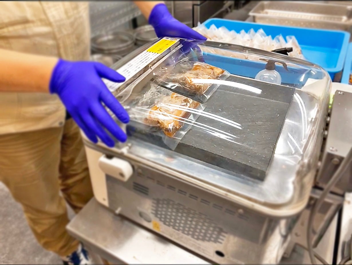 「真空調理」とは、下処理した食材や調味料を袋に入れ、真空パックにし、そのまま湯煎やスチームで低温加熱する調理法のことです。真空調理では、過度な加熱をしないため、食材本来の食感や美味しさをそのままに調理することが可能です。また、真空状態での調理の為、食材の中の空気が抜けて味が染み込みやすくなり、密閉状態なので二次汚染を防ぐこともできます。