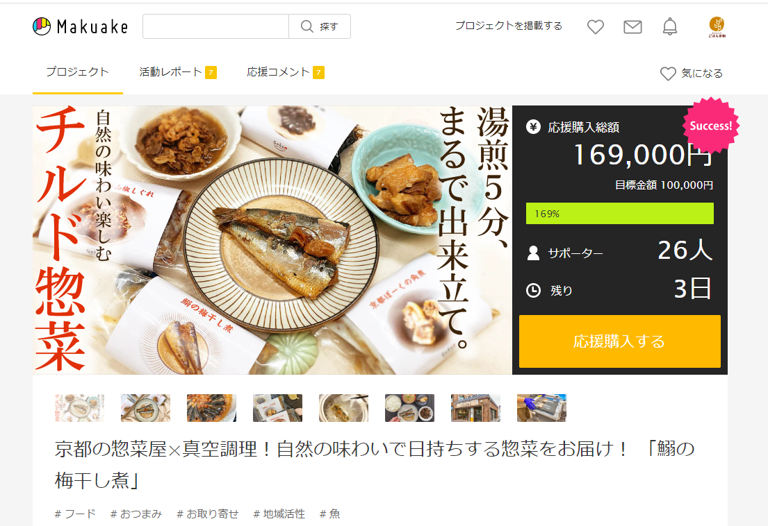 京都市内で惣菜・弁当のテイクアウト店「ごはん日和」を営む株式会社ホーラクは、「余計なものを使わない食べ物を、少しずつでも広げていきたい」という想いを広げるべく、製造時に保存料や着色料を使わず、「真空調理」によって素材本来の美味しさをそのままに日持ちするお惣菜「GOHAN BIYORI PLUS」の限定商品「鰯の梅干し煮」でMakuakeに挑戦します。