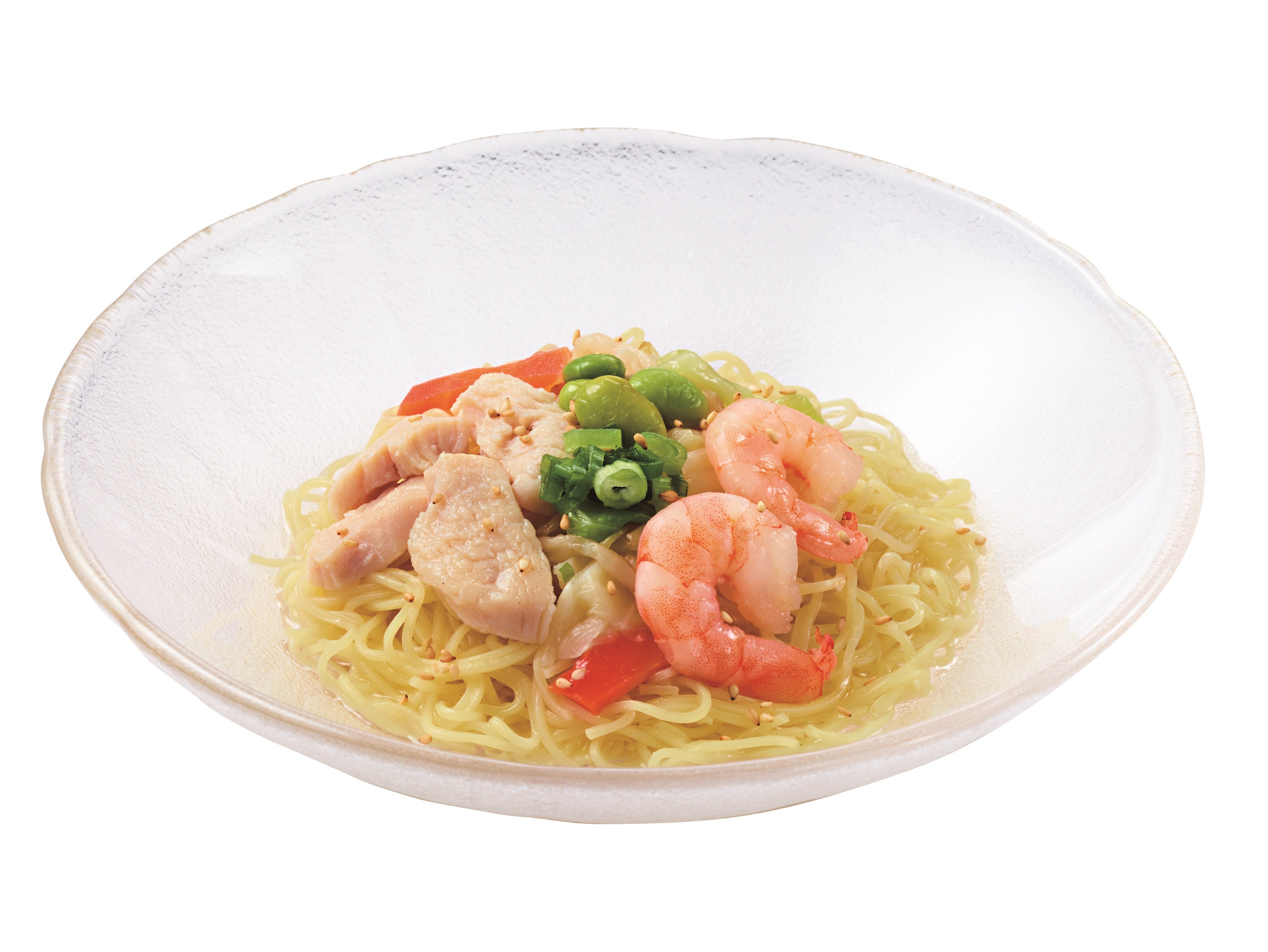 「海老と鶏の野菜涼風麺」は鶏肉、海老、キャベツ、人参、枝豆ともやしをトッピングし、のどごしの良い柚子塩スープはあっさりしつつも旨味の効いた味わいになっています。食欲が出ない日にもサッパリとした「海老と鶏の野菜涼風麵」がピッタリです。