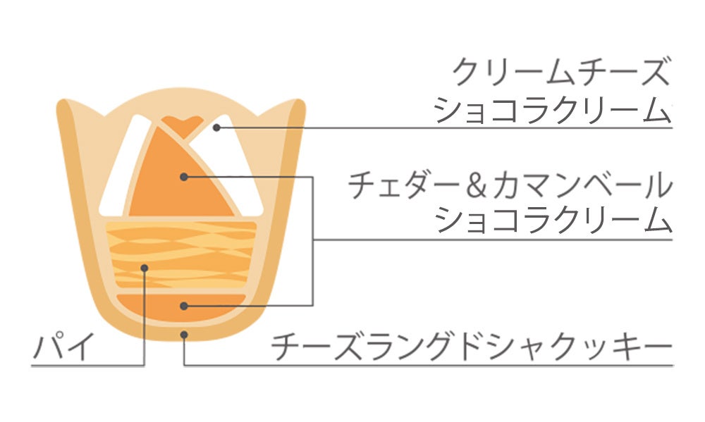 外は「芳醇ゴーダチーズのチューリップラングドシャ」。北海道産生乳100%のゴーダチーズを練りこんで、こんがり香ばしく焼きあげました。中は「4種のナチュラルチーズがとろけあうショコラクリームローズ」。コク豊かなチェダー&カマンベールチーズ風味のショコラクリームと、爽やかなクリームチーズ&マスカルポーネ風味のショコラクリームを香り豊かに重ねあわせました。