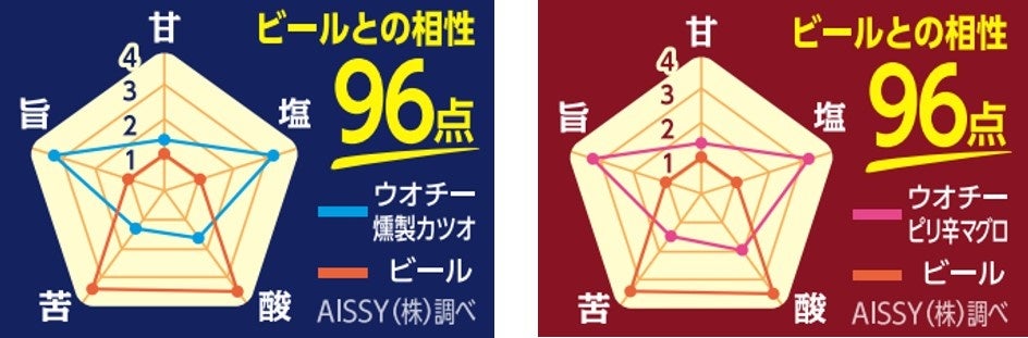 その結果、“赤ワインとステーキ“や“カレーと福神漬け”など、相性が良いと言われる王道の組み合わせにおいて、それぞれが100点満点中94点でしたが、“「クラフト 魚Chee(ウオチー)」シリーズとビール”の相性は96点という王道の組み合わせ以上の高得点をたたき出しました。ビールは強い苦味と酸味が特長であるのに対して、それと同等のしっかりとした旨味・塩味が「魚Chee」にあることで、味のバランスが良く相性が高い結果となっております。