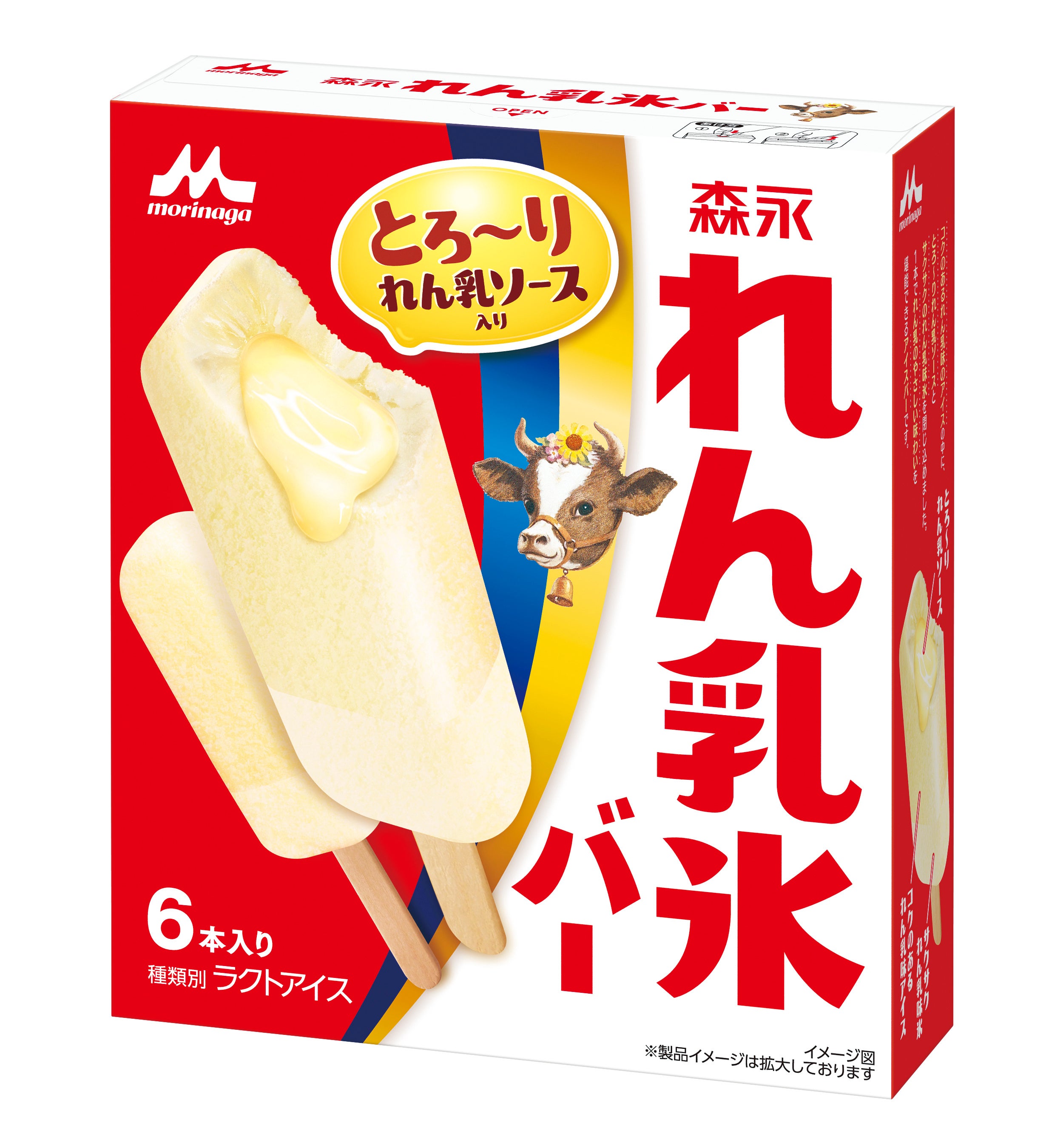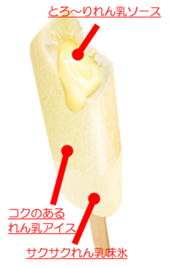 森永れん乳氷バー」はとろ~りれん乳ソースを増量し、れん乳味氷・れん乳味アイス部分のれん乳感をアップさせることで、れん乳好きの満足度を上げる1本にリニューアルいたしました。
