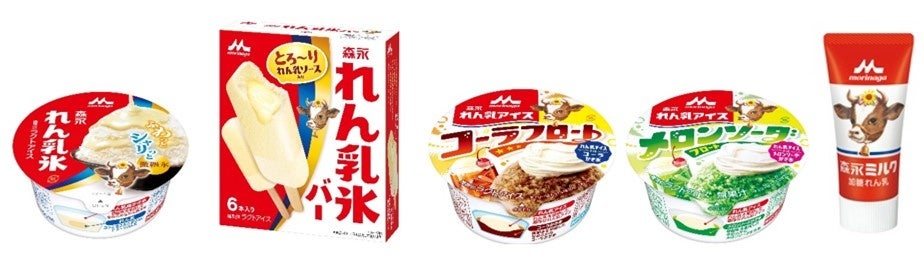 左から「森永れん乳氷」、「森永 れん乳氷バー(6本入り)」、「森永 れん乳アイス コーラフロート/メロンソーダフロート」「森永ミルク 加糖れん乳」