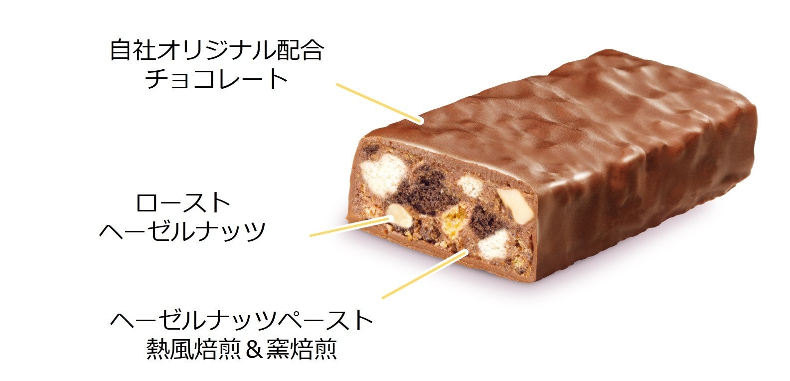 こだわりリニューアルしました。ヘーゼルナッツのペーストは2種類使用し、熱風焙煎で強ローストした少し苦みのある味わいと、窯焙煎した甘みとコクが活かした味わいのペーストを組み合わせることで、上品なコク深さを強化しました。また食感は、なめらかなチョコレートとサクサクのココアクッキーで”かろやか食感”に仕上げました。コク深く芳醇に香るヘーゼルナッツの味わいは春夏にもぴったりです。