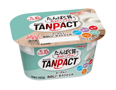「明治TANPACTヨーグルト 脂肪0 甘さひかえめ」は、脂肪0で甘さひかえめの後味がすっきりとしたあじわいのヨーグルトです。乳たんぱく質10gに加え、カルシウム・鉄分・ビタミンB6・ビタミンD・亜鉛の1日の不足分を配合※2しました。満足感のある180g入りです。