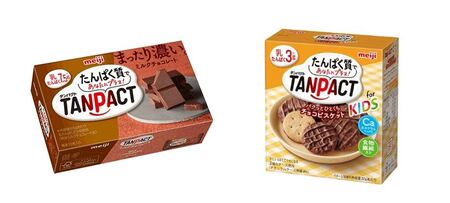 左より「タンパクトミルクチョコレート箱」(65g)、「タンパクトミニビスケットfor KIDS」(32g)