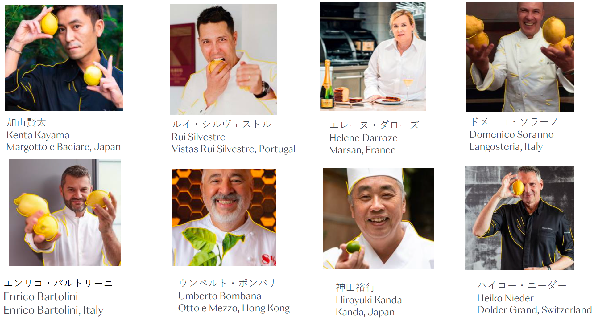 25か国以上の100名以上にのぼるクリュッグアンバサダーシェフたちによるオリジナルレシピを集録した参画シェフは、アンヌ=ソフィー・ピック、ティム・ラウエ、エレーヌ・ダローズ、ホアン・アマドール、ウンベルト・ ボンバナ、ギョーム ・ガリオ、エンリコ ・バルトリーニ、神田裕行、トリスティン・ファーマー、ビョルン・フランツェン、ぺピン・ヴァンデン・アベール、アルド・ ソームら錚々たるメンバーが並び、彼らが獲得したミシュランの星の合計は113個。