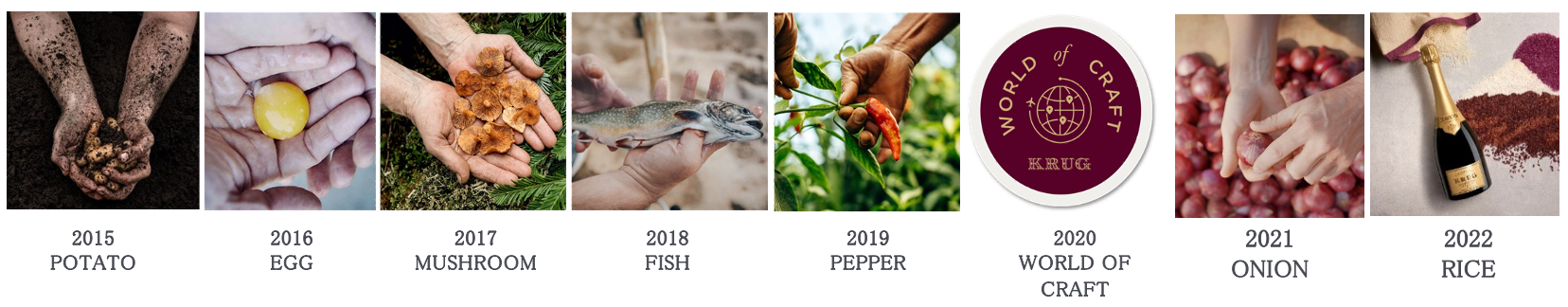 シャンパーニュメゾン クリュッグは、真のクラフトマンシップはシンプルさとテロワールとのつながりから生まれると考え、自然の滋養に満ちたシャンパーニュの美しさをより引き立てる方法を探し求めてきました。クリュッグのサヴォアフェールの根幹である「独自性」は、各区画ごとのブドウの木がそれぞれの異なるワインへと姿を変えることを通じて、クリュッグのシャンパーニュ自体が単一食材から成ることを理解する芸術なのです。クリュッグはこの哲学を根幹に、毎年素朴なひとつの素材に敬意を表し、一杯のクリュッグ シャンパーニュと合わせたときにもたらす多くの喜びを追求しています。それがクリュッグ×単一食材プログラムです。