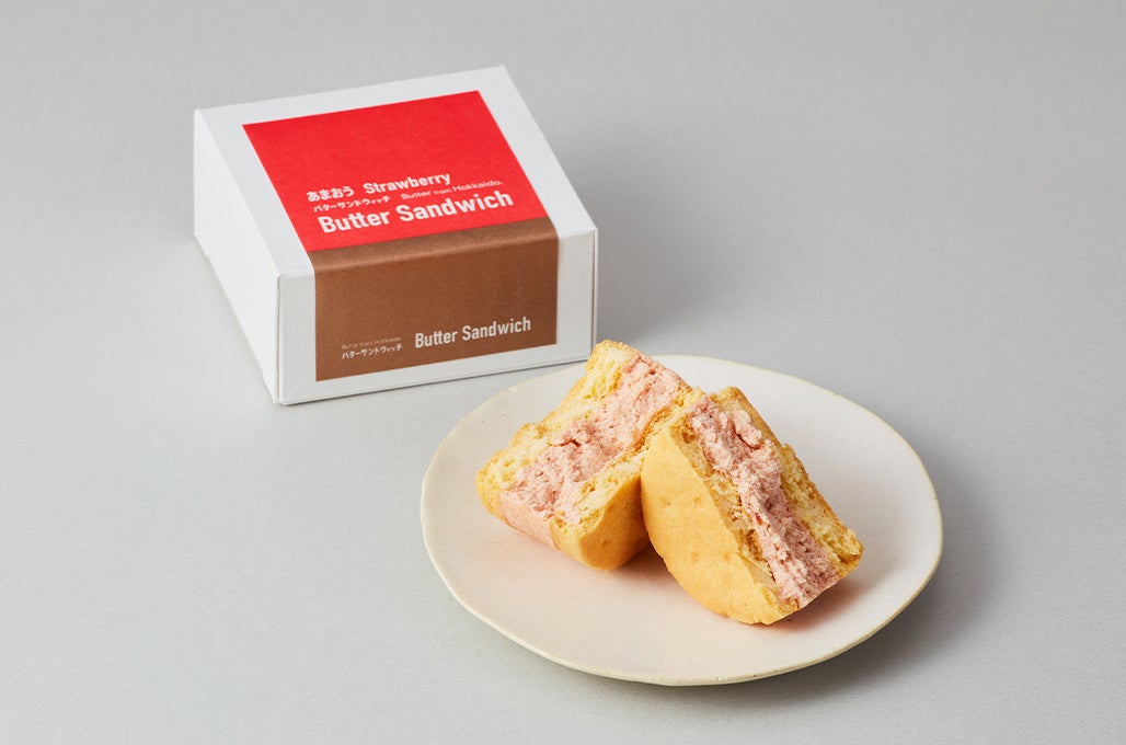 バターサンドウィッチ あまおうは、福岡県久留米市のうるう農園*1のあまおうを使用した贅沢なバターサンドウィッチです。手間のかかる土耕栽培により、甘さと酸味が絶妙なバランスに育ったあまおうを濃縮したピューレにし、北海道産の濃厚なバタークリームと混ぜあわせました。いちごの甘酸っぱさとバターのコクが口の中いっぱいに広がる至福の時間をお楽しみいただけます。