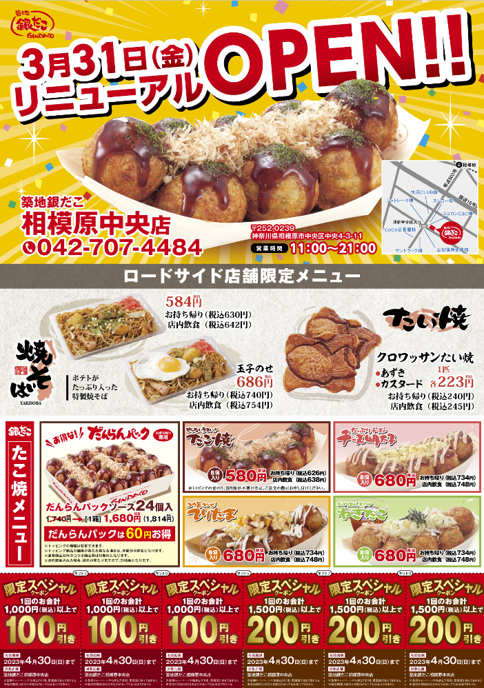 - 築地銀だこ 相模原中央店 ※店舗近隣配布用チラシイメージ(リニューアルオープン記念のお得なクーポン付)