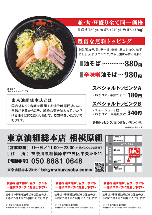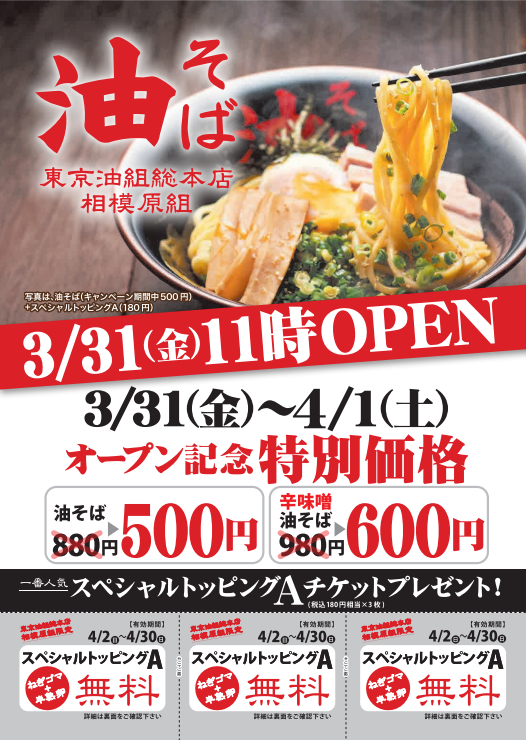 今回、全国初のコラボ出店を記念し、2023年3月31日(金)、4月1日(土)の2日間、「油そば」ワンコイン500円(税込)、「辛味噌そば」600円(税込)の特別価格 でお召し上がりいただけるオープニングキャンペーンを実施いたします! 東京油組総本店の油そばをまだ召し上がったことがない方は、ぜひこの機会に一度お試しください!※並盛り・大盛り・W盛り全て同一価格(東京油組総本店 相模原組のみで実施)