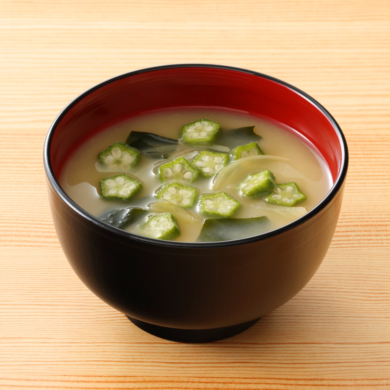 とろっとしたオクラの食感と玉ねぎの甘みが絶妙な、合わせみそ仕立てのおみそ汁。