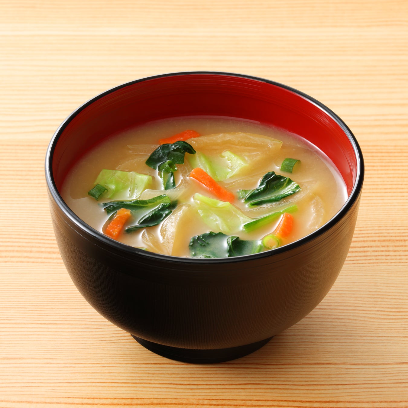 五種の野菜(玉ねぎ、ほうれん草、キャベツ、にんじん、ねぎ)を使用した、合わせみそ仕立ての彩り豊かなおみそ汁。