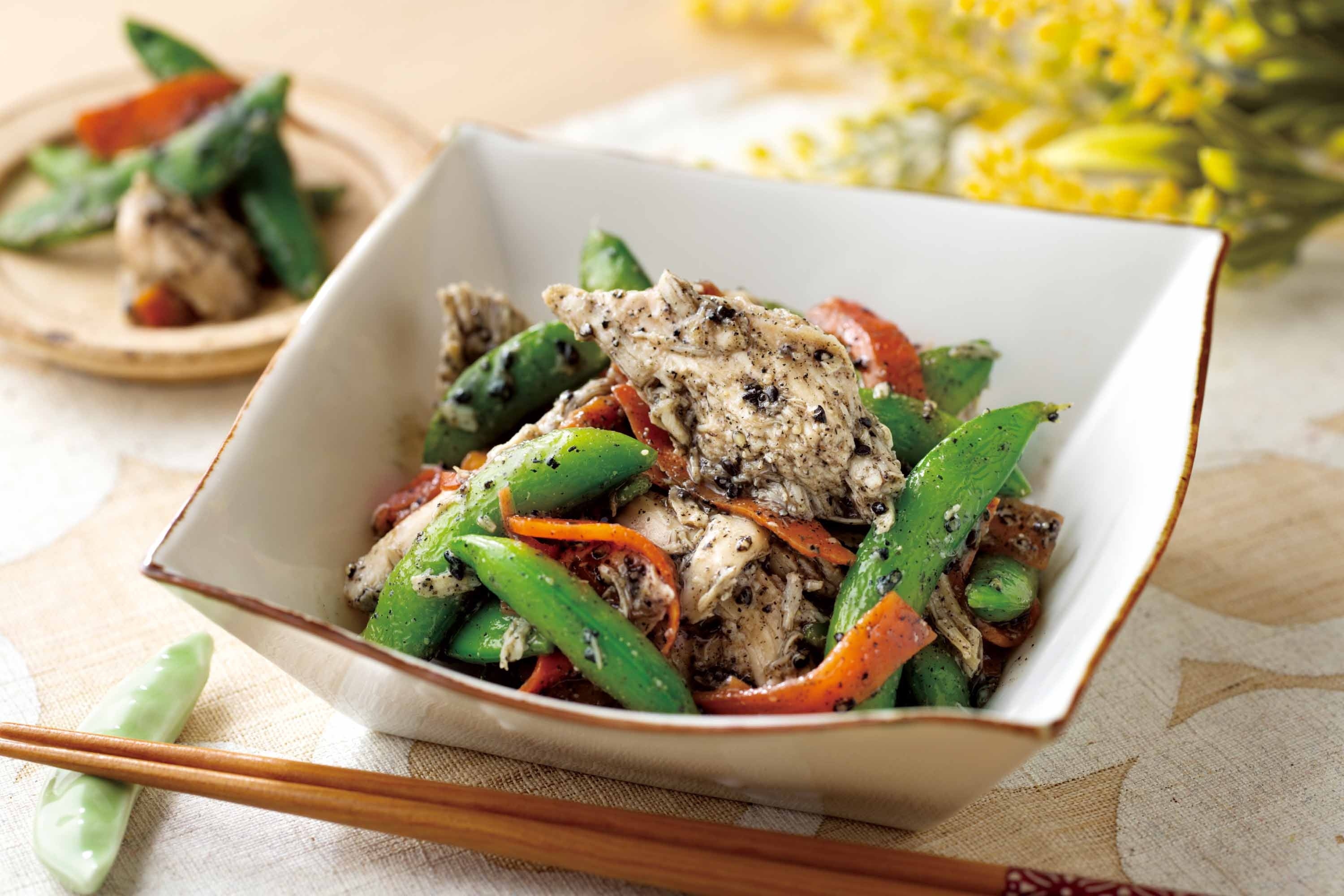 パリっとした食感が美味しさを引き立てる「スナップエンドウと蒸し鶏の黒胡麻和え」が期間限定で登場。